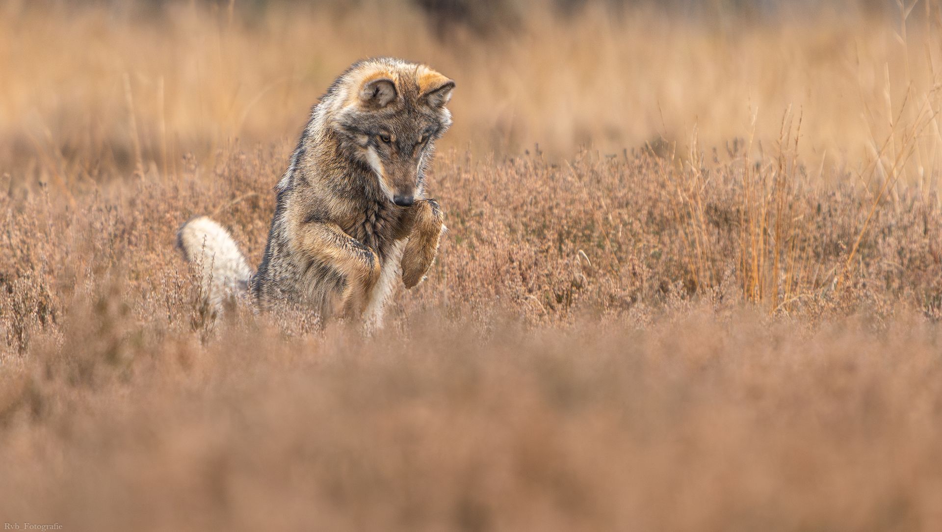 Vooral jonge wolven jagen ook op muizen en andere kleine knaagdieren, en oefenen zo hun vaardigheden voor de jacht. Dit gedrag zie je ook bij vossen, en zelfs bij de gedomesticeerde versie van de wolf, onze honden. Het is een fascinerend gezicht. Beeld: Ramon van bentum